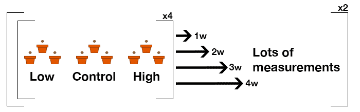 Finally, no matter how many seeds you plant in each soil type, only doing an experiment once is not ok! You need to have a sample size (n) of at least 3 (ie: 3 seeds grown in each soil), repeated on at least two separate occasions. Minimum. These repetitions are critical because sometimes crap happens that you don't realize. Maybe the first time you ran the experiment, your summer student forgot to water one set of pots for half the time. Or something out of your control happened that caused false results. Repetition normalizes these variables so you can determine the true effects of what you're testing.
